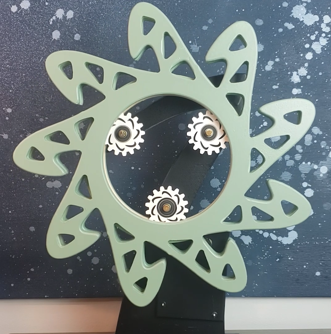 I designed this kinetic sculpture which uses 3 planetary gears to continuously spin the outer ring. The ring is supported and held captive on the frame by the planetary gears only. It incorporates both wooden and 3D printed parts.